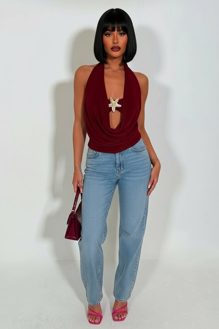 Make a statement with this striking cowl halter backless top in rich burgundy. The dramatic draped neckline creates an elegant silhouette, while the distinctive gold starfish buckle detail adds a touch of coastal glamour. Perfect for evening events, nights out, or when you want to turn heads, this piece combines sophistication with bold style. The backless design ensures maximum impact—ideal for those confident enough to embrace modern fashion. Pair with tailored trousers or a sleek skirt for an unforgettable look.