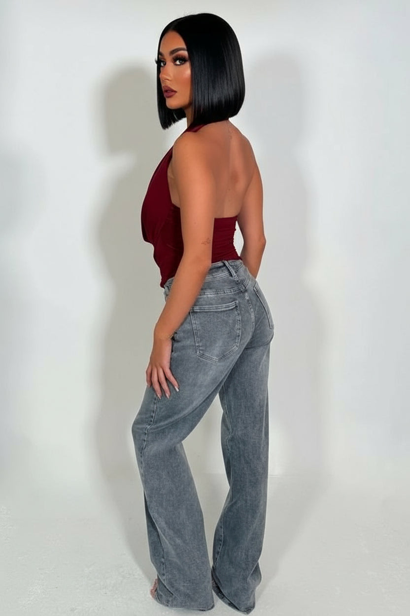 Cowl Halter Backless Top with Gold Starfish Buckle Burgundy