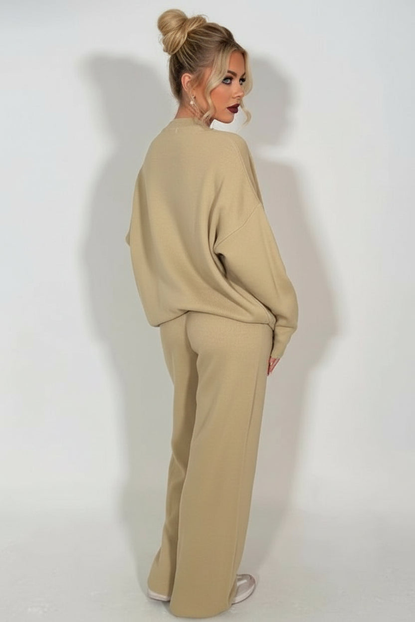 Sink into ultimate comfort with this beautifully crafted knitted lounge set in soft beige. Featuring a striking contrast emblem detail, it effortlessly blends style with relaxation. The premium knit fabric offers a luxurious feel against your skin, while the coordinated two-piece design ensures a polished, put-together look whether you're unwinding at home or stepping out casually. Perfect for those who refuse to compromise on comfort or aesthetics, this versatile set becomes an instant wardrobe essential for cosy days and laid-back evenings.
