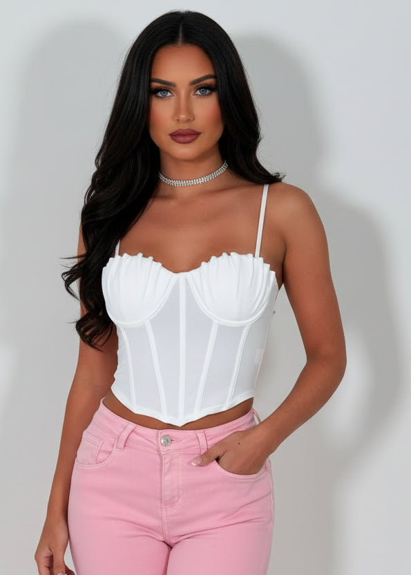 A striking white corset top that combines structured elegance with eye-catching design. The fitted bodice features boning for a sculpted silhouette, while delicate seashell detailing adds a unique textural element. Adjustable straps ensure a secure, comfortable fit. Perfect for making a statement at special occasions or layering over your favourite pieces for everyday edge. The structured construction provides support and flatters the figure beautifully.
