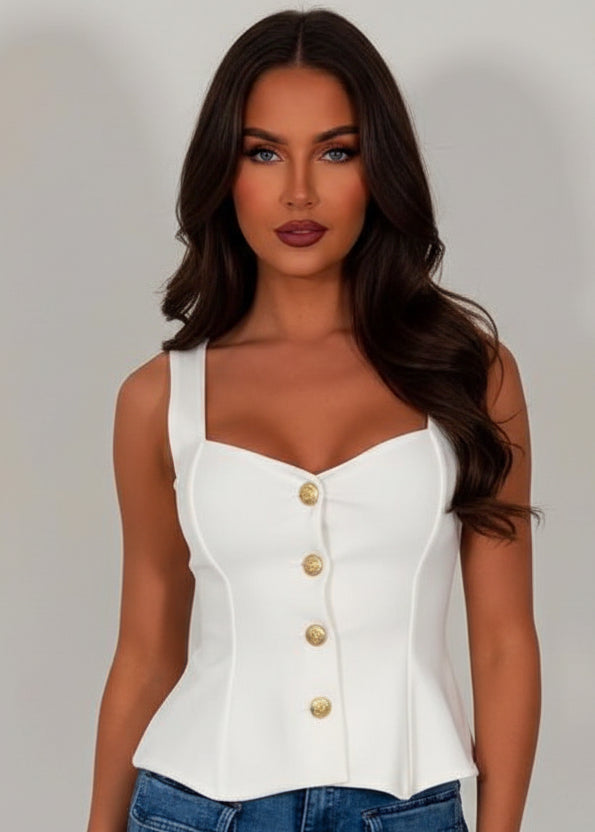 Elevate your evening wardrobe with this stunning white going out top. Crafted for sophistication, it features eye-catching gold buttons that add a touch of glamour and luxury to any outfit. The crisp white fabric provides a clean, versatile base that pairs effortlessly with tailored trousers, skirts, or jeans for a polished look. Perfect for nights out, special occasions, or when you want to make a refined statement. The gold button detailing catches the light beautifully, ensuring you stand out for all the right reasons.