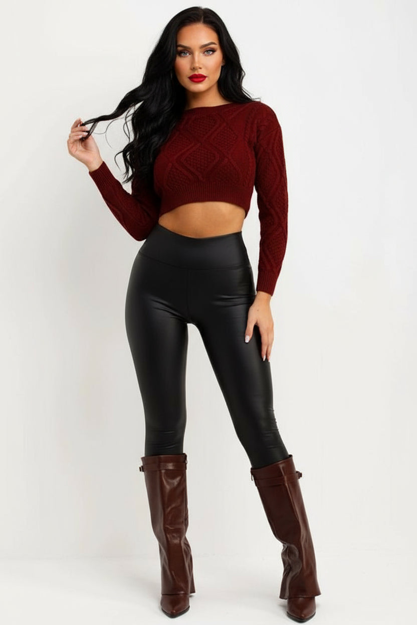 Cable Knit Crop Long Sleeve Jumper Burgundy