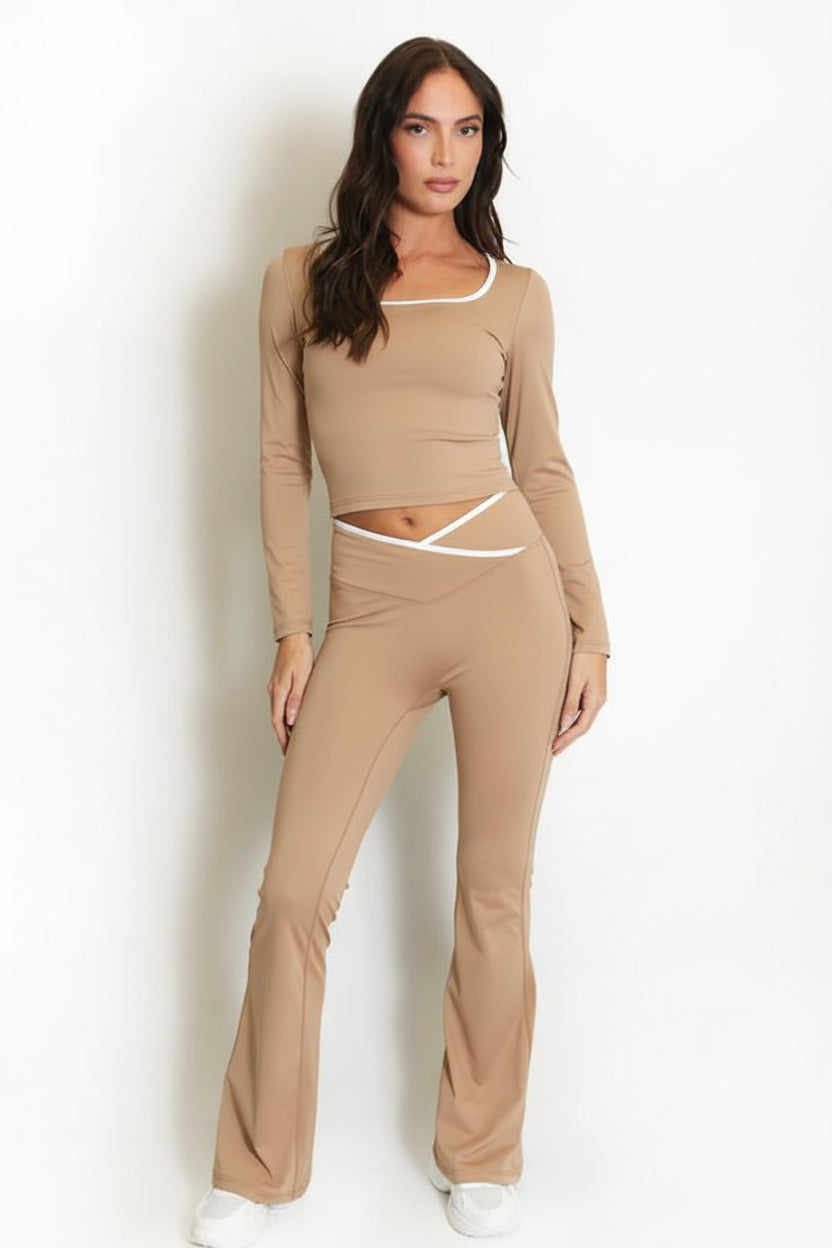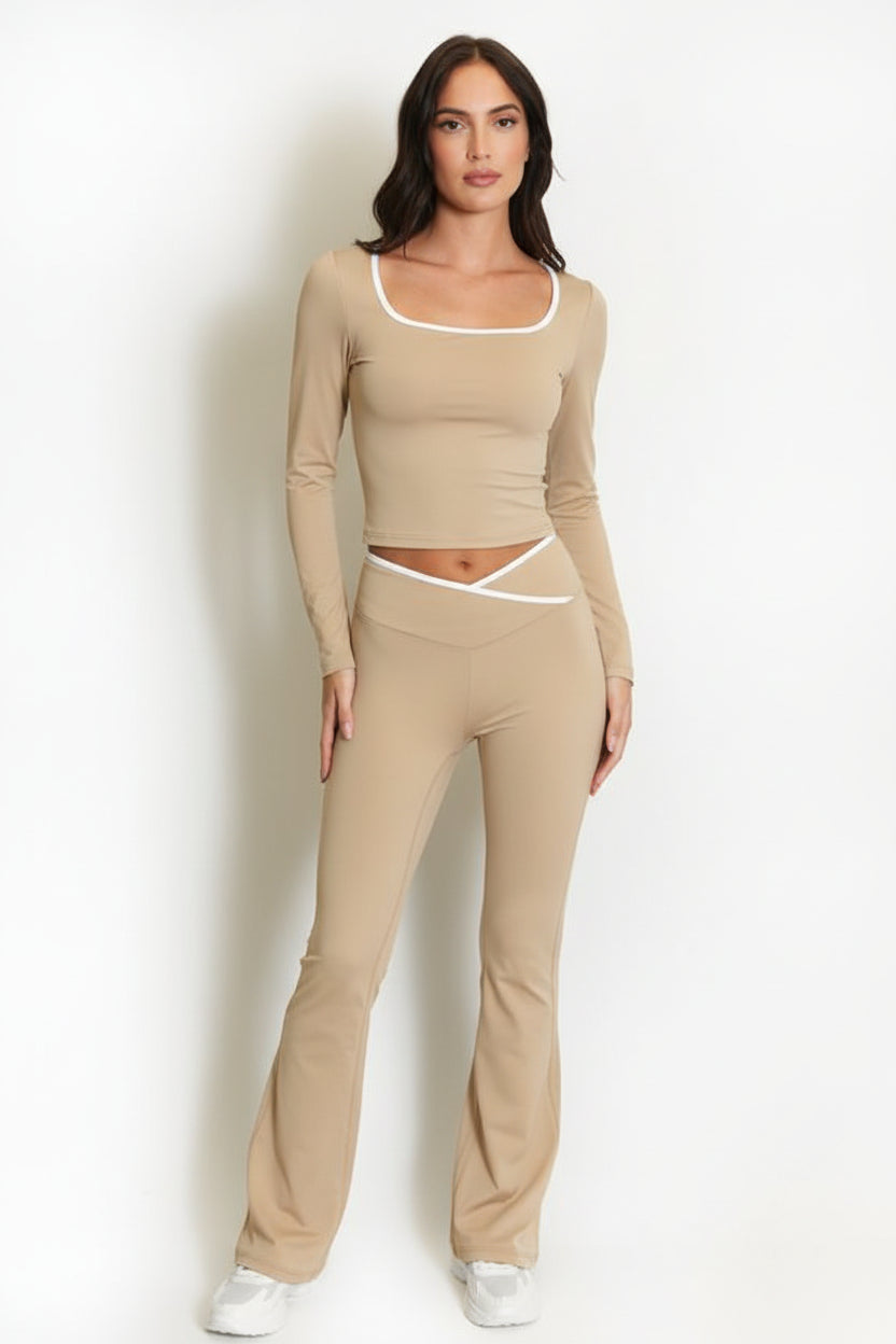 Contrast Edge Square Neck Top and Flare Hem Trouser Set Beige