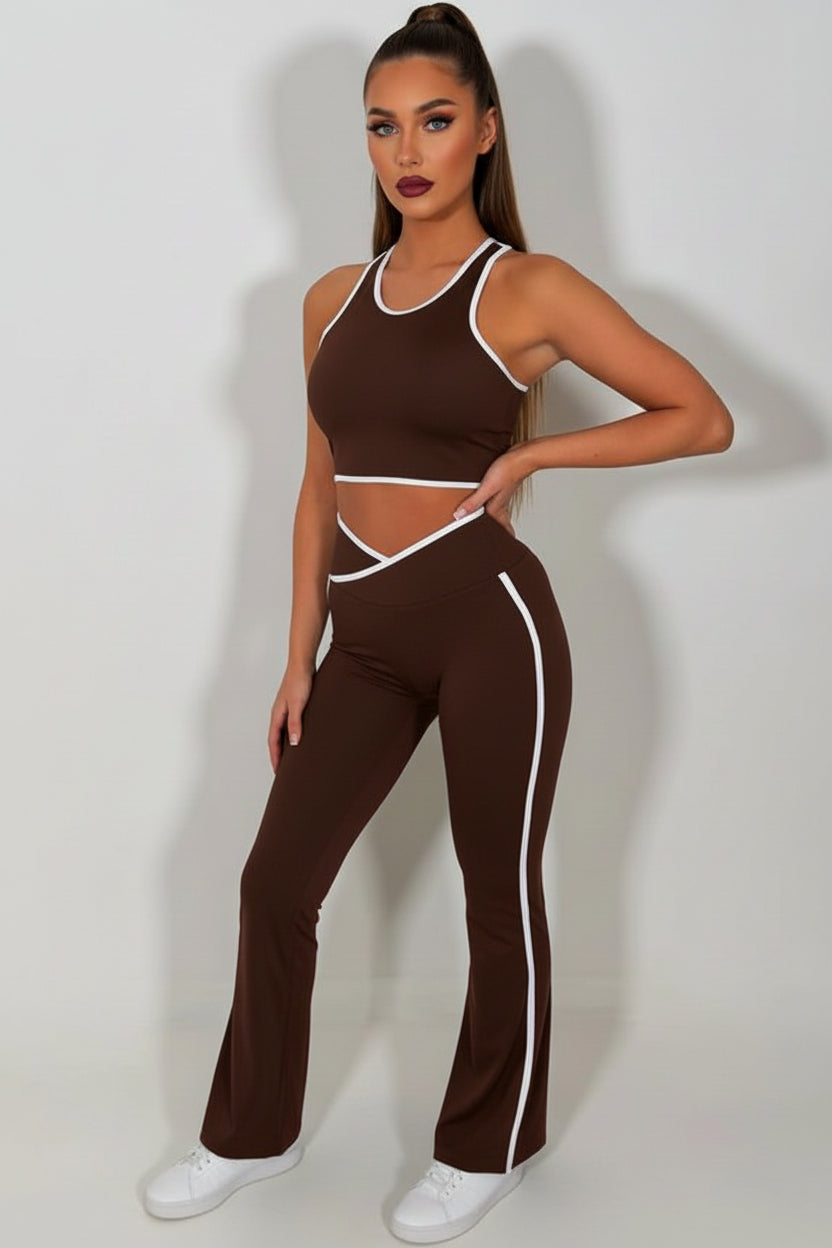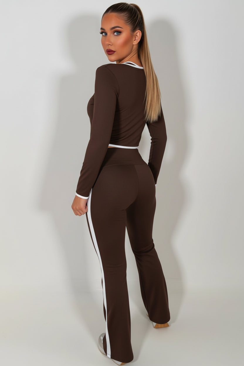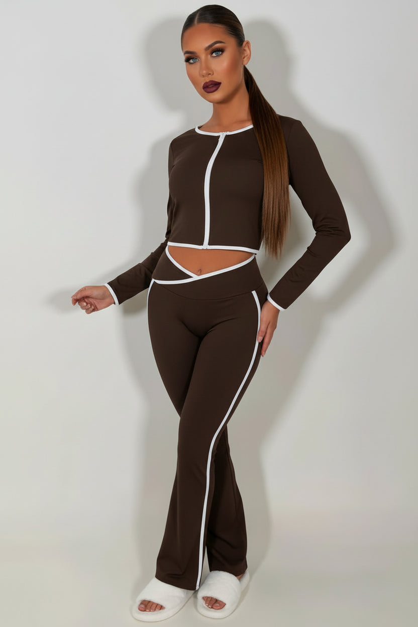 Flare Pants Zip Up Sports Jacket And Crop Top 3 Piece Co Ord Set Brown