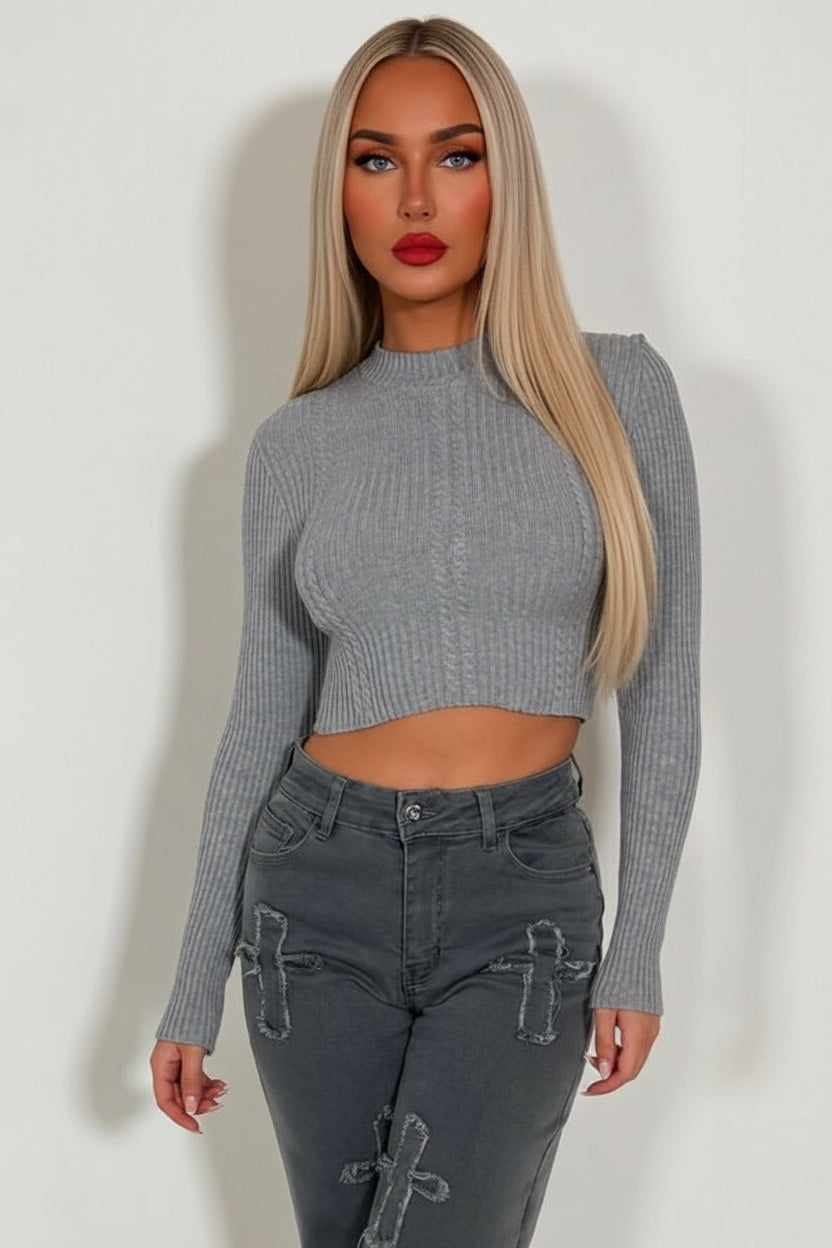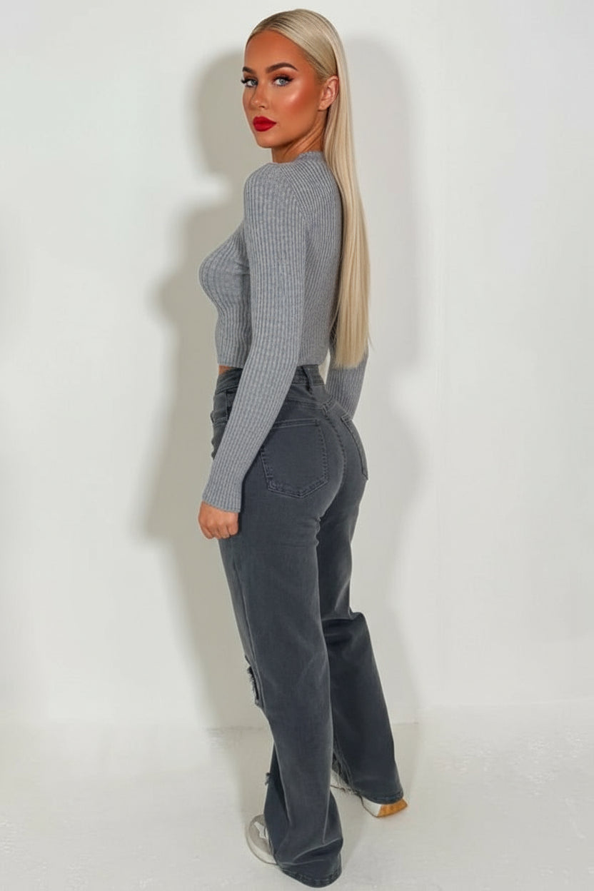 Rib Knit Cropped Long Sleeve Jumper Grey
