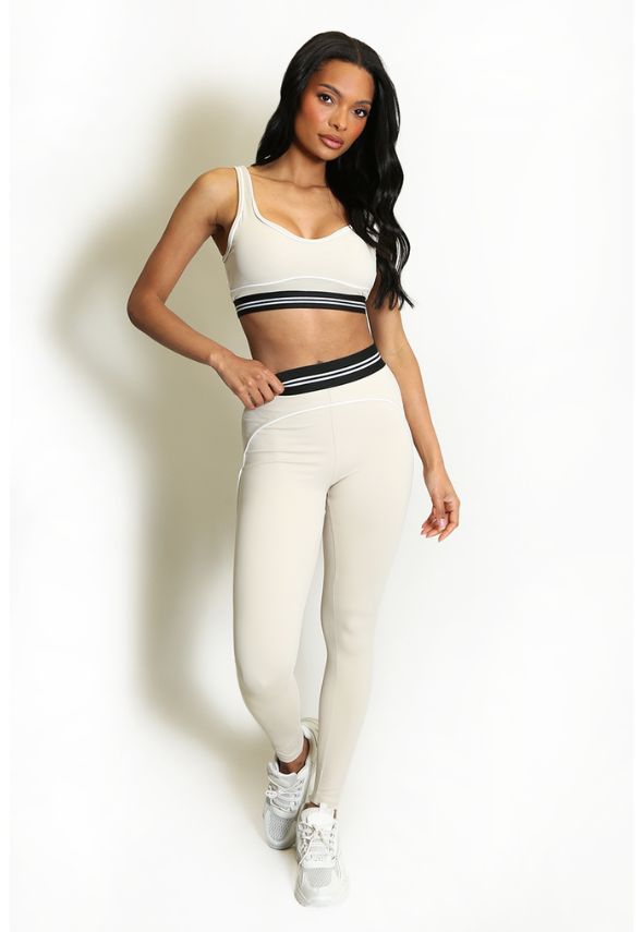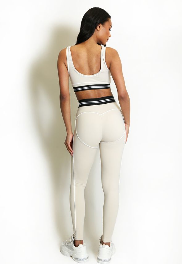 Striped Band Gym Crop Top And Legging Set Beige