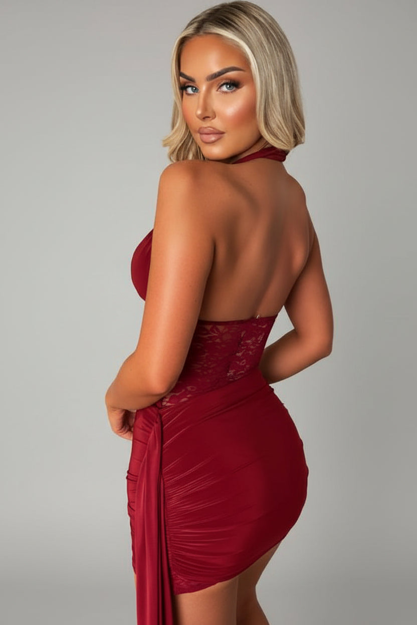 Elevate your evening look with this stunning burgundy halter mini dress, where delicate lace detailing at the waist creates an irresistibly feminine silhouette. The adjustable sash cinches perfectly to flatter your figure, while the halter neckline offers elegant support and a touch of sophistication. Rich burgundy hues complement all skin tones, making this versatile piece ideal for nights out, special occasions, or whenever you want to turn heads. The mini length keeps things playful and modern, while premium lace accents add undeniable glamour. Slip into confidence and timeless style.