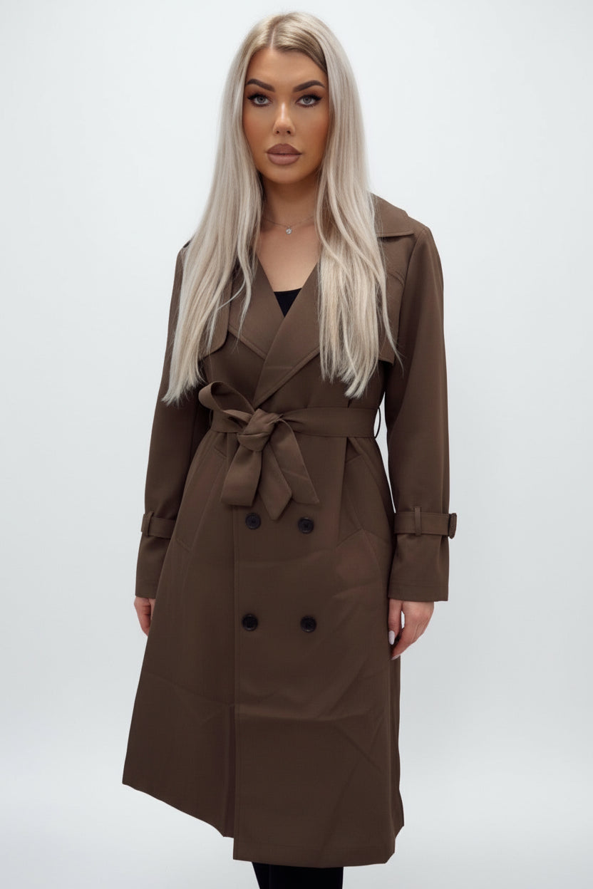 A timeless wardrobe essential that effortlessly elevates any outfit. This classic brown trench coat features a structured silhouette with a cinched waist belt that defines your figure and adds sophisticated style. The versatile design transitions seamlessly from office to evening, layering beautifully over dresses, jeans, or tailored trousers. Crafted for durability and comfort, it's the investment piece that works harder than any other jacket in your collection. Perfect for British weather and endless styling possibilities.