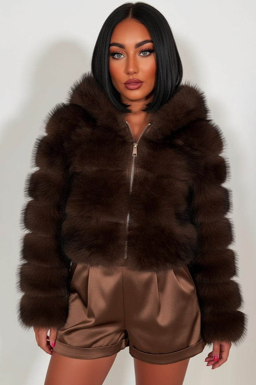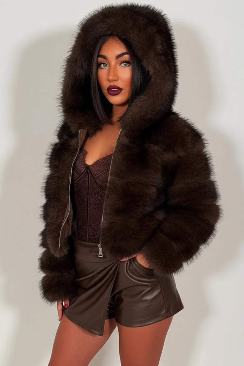 Wrap yourself in luxury with this stunning brown faux fur jacket, designed to elevate any winter wardrobe. The plush faux fur delivers that coveted high-end look without compromising on ethics or your budget. An attached hood provides extra warmth and versatility, perfect for unpredictable British weather. Whether you're heading to a night out or layering for everyday comfort, this jacket combines style with practicality. The rich brown tone pairs effortlessly with virtually any outfit, making it a timeless investment piece that works season after season. Experience the softness, warmth, and undeniable glamour that comes with every wear.