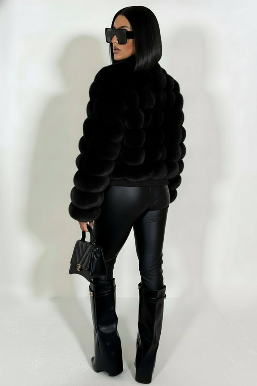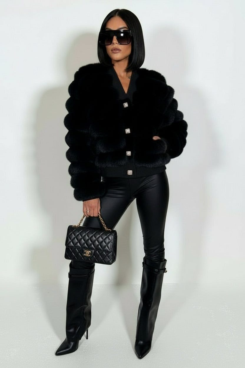 Elevate your layering game with this sophisticated faux fur cardigan, crafted from premium synthetic materials that deliver genuine luxury without compromise. The rich black provides versatile styling potential, seamlessly transitioning from casual daywear to evening occasions. Distinctive gold button fastenings add a refined touch of glamour, creating an understated yet impactful focal point. The plush texture offers exceptional warmth and comfort, whilst maintaining a lightweight construction ideal for layering. Perfect for those who appreciate quality craftsmanship and timeless elegance in their wardrobe essentials.
