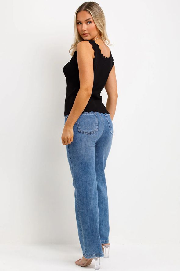 This black knitted vest top features a delicate scalloped neckline, adding a refined touch to its classic design. Crafted from soft, breathable yarn, it offers lightweight comfort ideal for layering or wearing alone. Its tailored fit enhances silhouette definition, making it a versatile piece for both casual and smart ensembles. Perfect for elevating your wardrobe with understated elegance and texture.