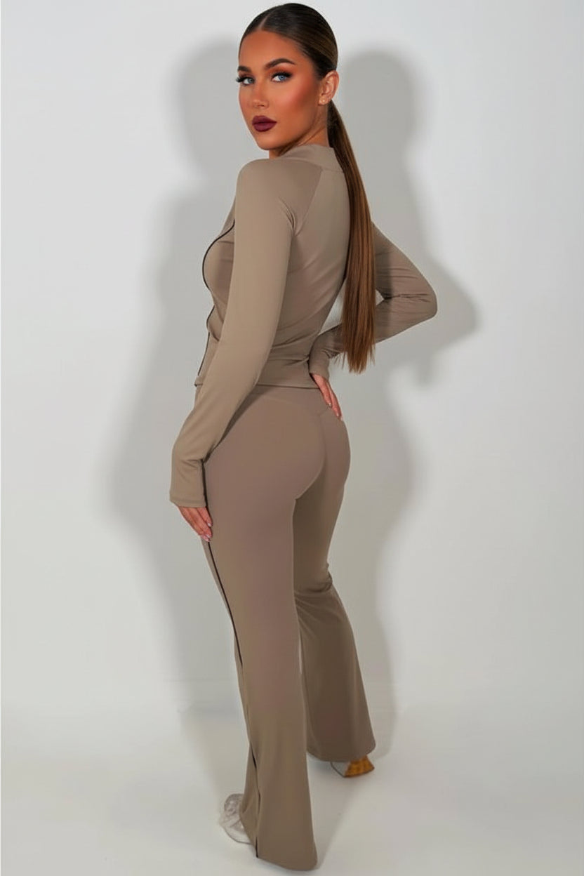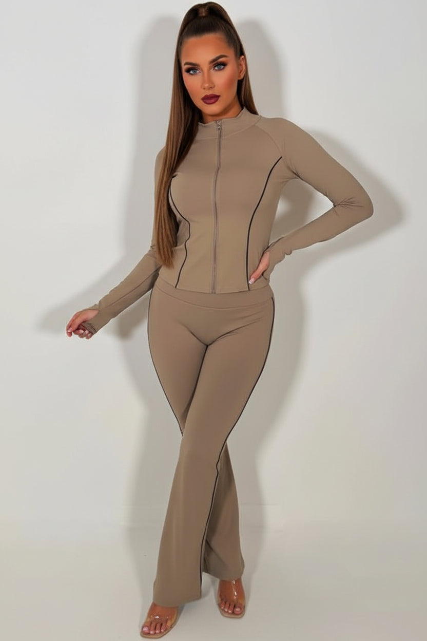 High Rise Flare Pant And Zip Up Sports Jacket Co Ord Set Beige
