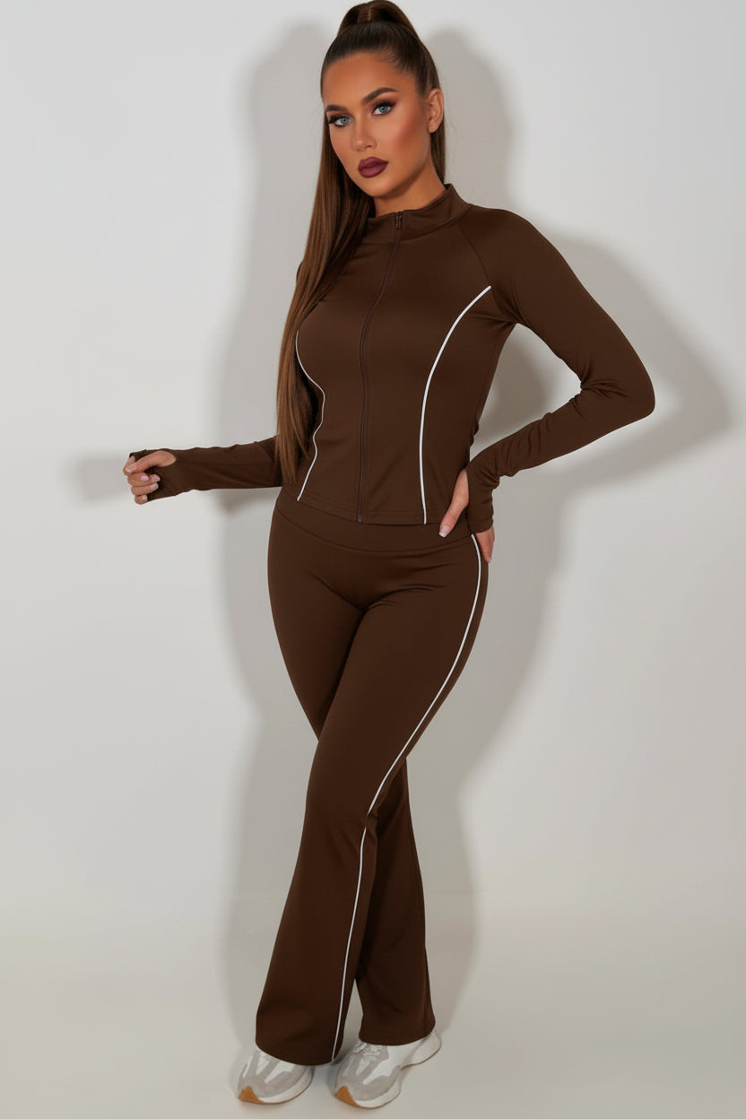 High Rise Flare Pant And Zip Up Sports Jacket Co Ord Set Brown