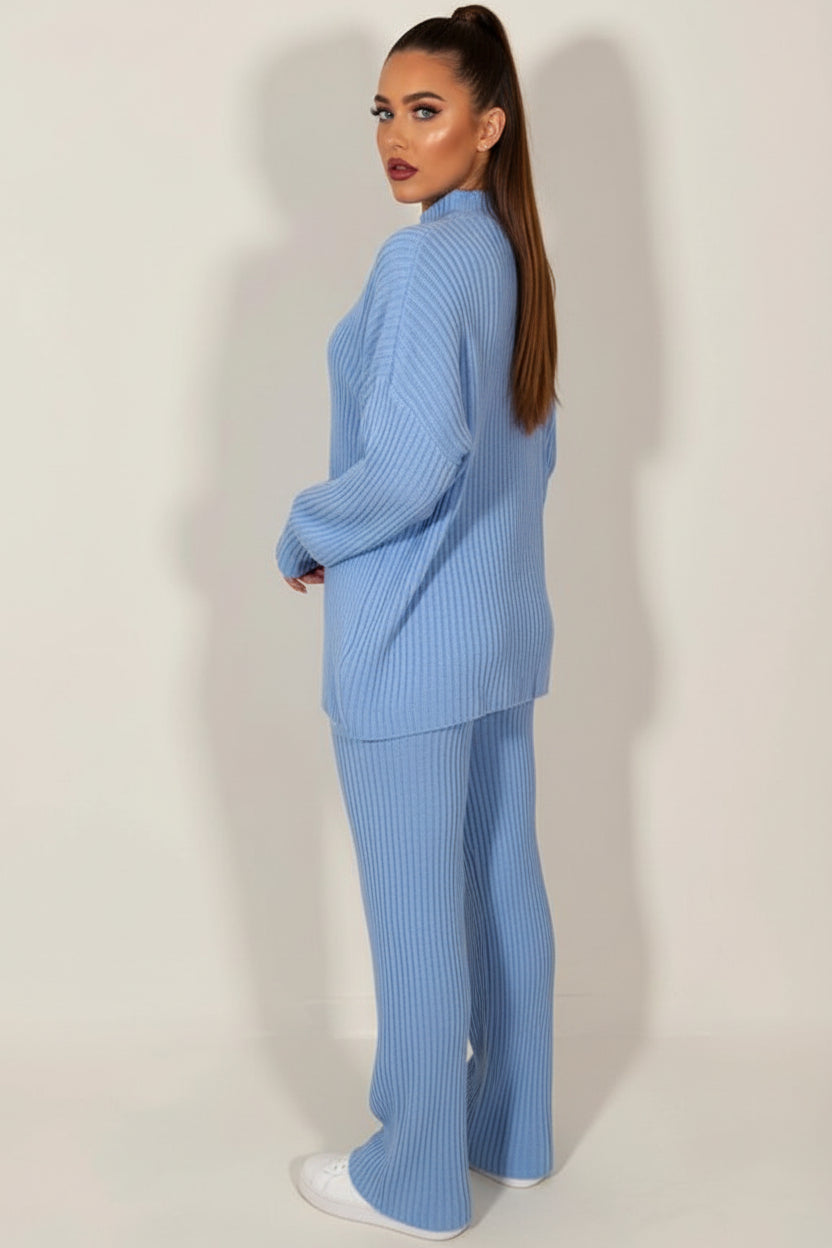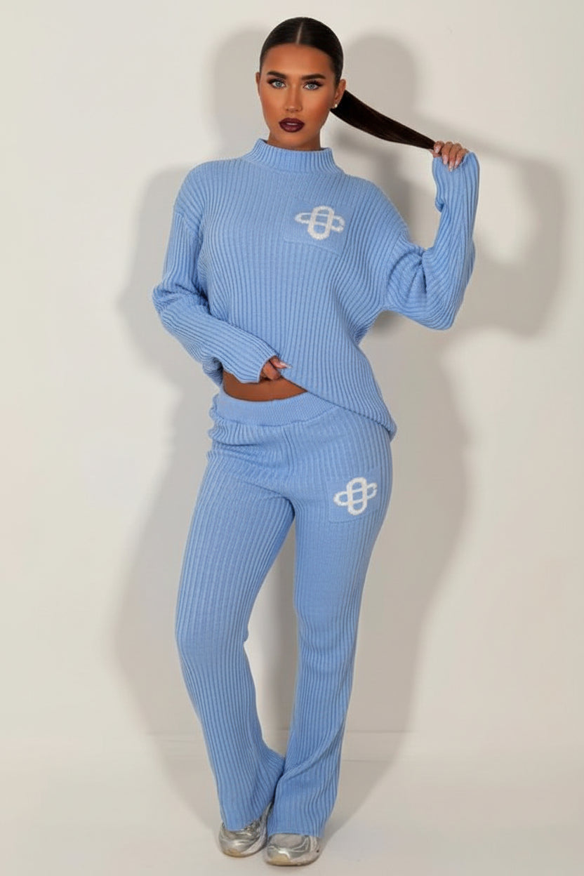 Rib Knitted Lounge Set With Contrast Emblem Blue