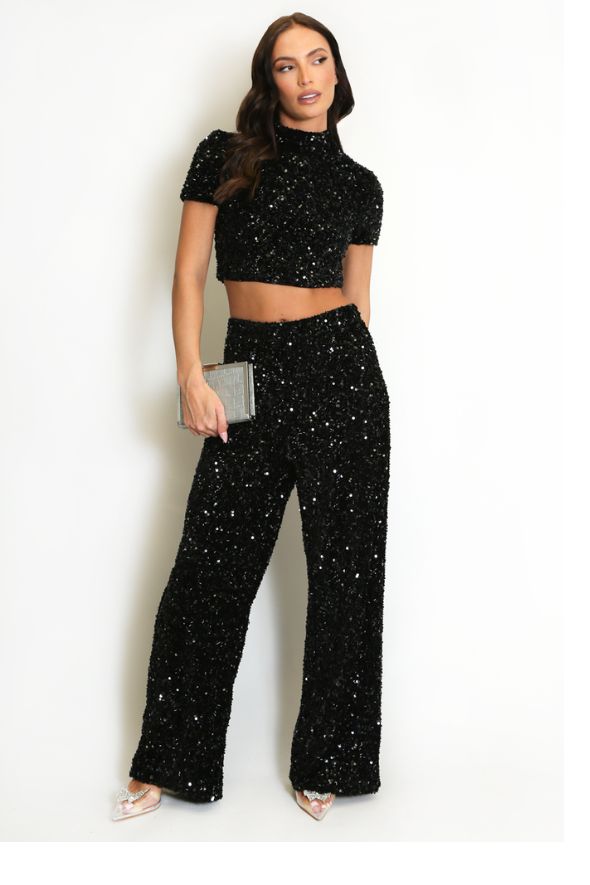 Make a statement with these stunning sequin high-waisted wide-leg trousers in classic black. The shimmering sequin detailing catches the light beautifully, adding glamour to any occasion without overwhelming your look. The high waist creates a flattering silhouette while the relaxed wide-leg cut ensures comfort and movement. Perfect for nights out, parties, or whenever you want to elevate your everyday style with a touch of sparkle. Pair with a simple top to let these show-stopping trousers take centre stage.