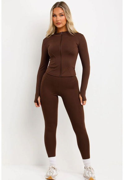 Zip Up Sports Jacket And Seamless Leggings Co Ord Set Brown