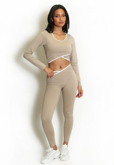 Long Sleeve Contrast Hem Top & Leggings Set Beige