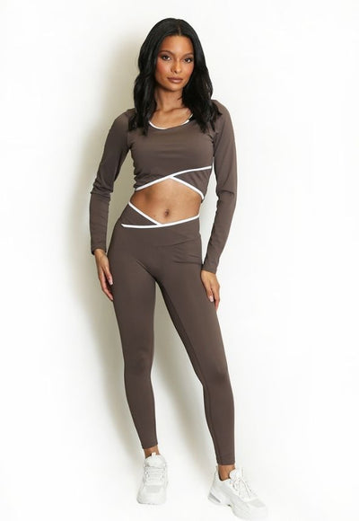 Long Sleeve Contrast Hem Top & Leggings Set Brown