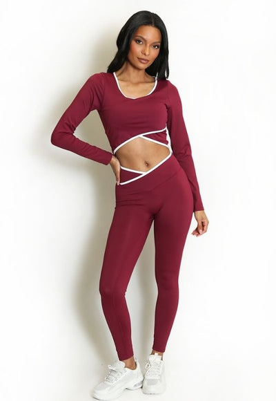 Long Sleeve Contrast Hem Top & Leggings Set Burgundy