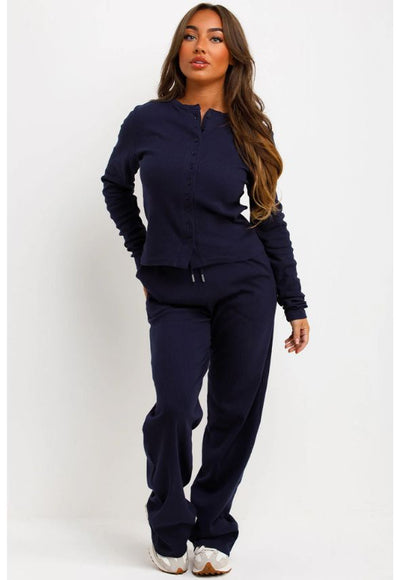 Rib Button Up Long Sleeve Top And Trouser Loungewear Set Navy