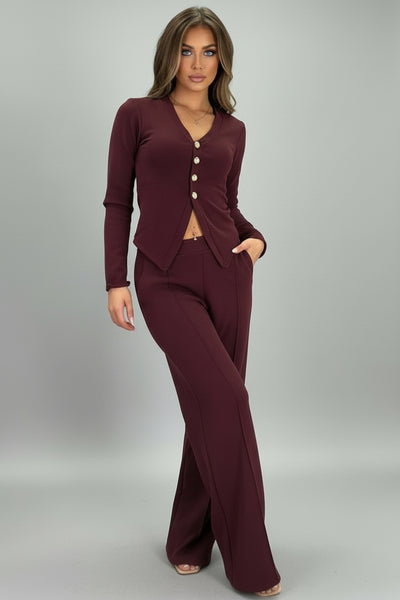 Long Sleeve Gold Button Top & Trouser Set Wine