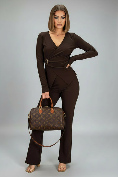 Brown Long Sleeve Top And Trouser Co Ord With Gold Buckle