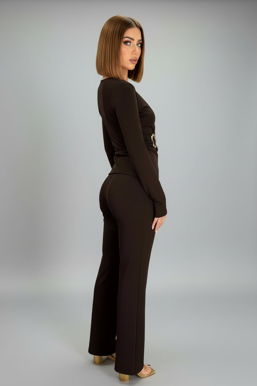 Brown Long Sleeve Top And Trouser Co Ord With Gold Buckle