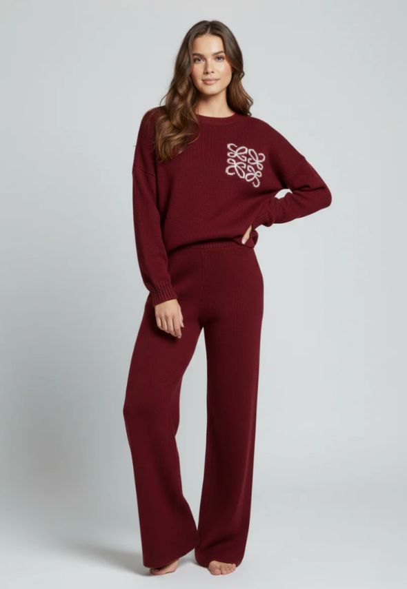 Long Sleeve Knitted Top & Wide Leg Trouser Co-ord Burgundy