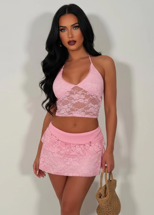 Pink Plunge Halter Lace Top & Ruffle Skort Co Ord Set