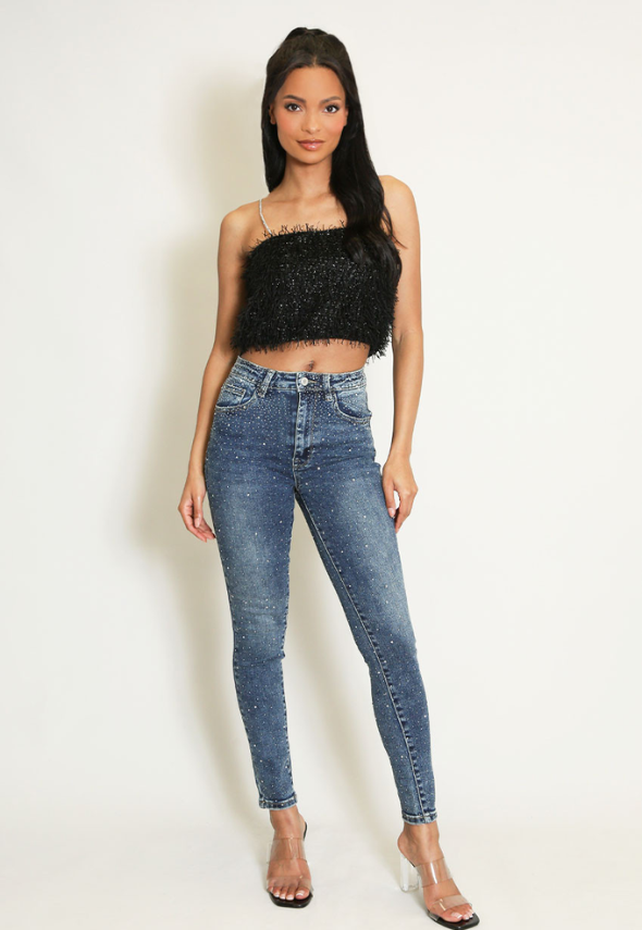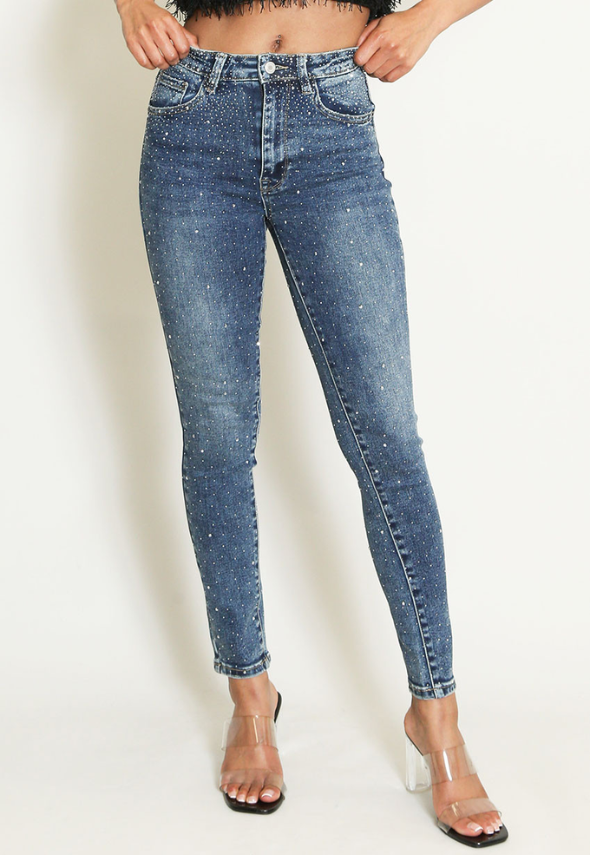 Make a bold statement with these All Over Studded Skinny Jeans, where edgy style meets flattering fit. Covered in gleaming studs from waist to hem, they transform any outfit into an eye-catching ensemble perfect for nights out or fashion-forward days. The classic skinny silhouette hugs your curves while the metallic embellishments catch the light with every move. Pair with a simple top to let these statement jeans shine, or go full rock-chic with a leather jacket. Elevate your denim game and turn heads wherever you go.