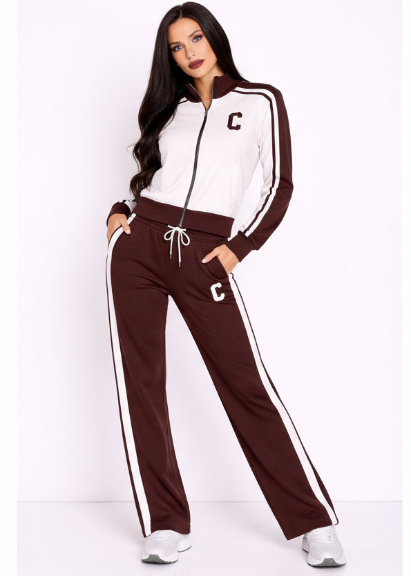 Stay cosy and stylish in this adorable zip through tracksuit, featuring a classic brown and white colour block design. Perfect for lounging at home, running errands, or casual outings, this two-piece set combines comfort with contemporary flair. The soft fabric moves with you, while the zip-through top offers easy layering options. Pair it with trainers for an effortless athleisure look that works from day to night.