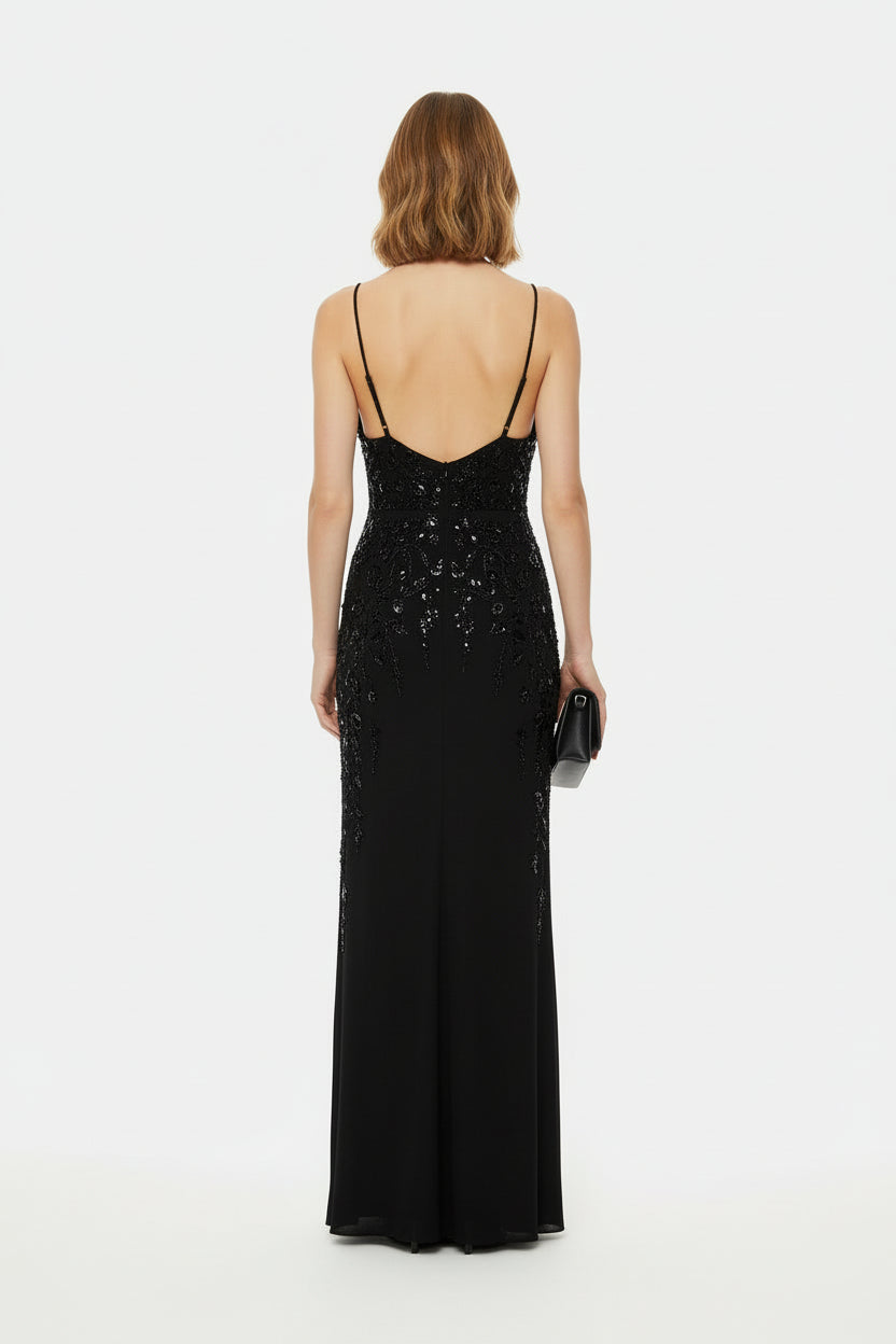 Make a statement in this stunning black maxi dress, designed to turn heads at any occasion. The daring plunge neckline creates an elegant focal point, while intricate embellishments add glamour and sophistication throughout. The flowing maxi silhouette flatters your figure and moves beautifully with every step. Perfect for evening events, celebrations, or whenever you want to feel confident and radiant. This versatile piece transitions seamlessly from formal gatherings to upscale nights out, ensuring you'll reach for it again and again.