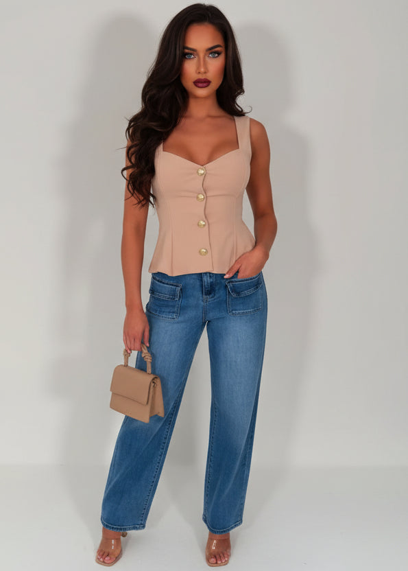 Elevate your evening wardrobe with this stunning sand going out top. Crafted for sophistication, it features eye-catching gold buttons that add a touch of glamour and luxury to any outfit. The crisp white fabric provides a clean, versatile base that pairs effortlessly with tailored trousers, skirts, or jeans for a polished look. Perfect for nights out, special occasions, or when you want to make a refined statement. The gold button detailing catches the light beautifully, ensuring you stand out for all the right reasons.