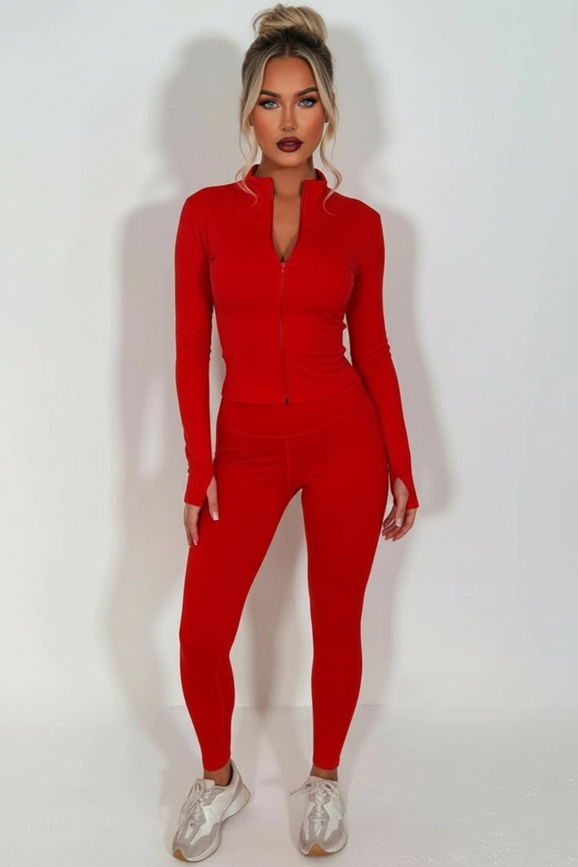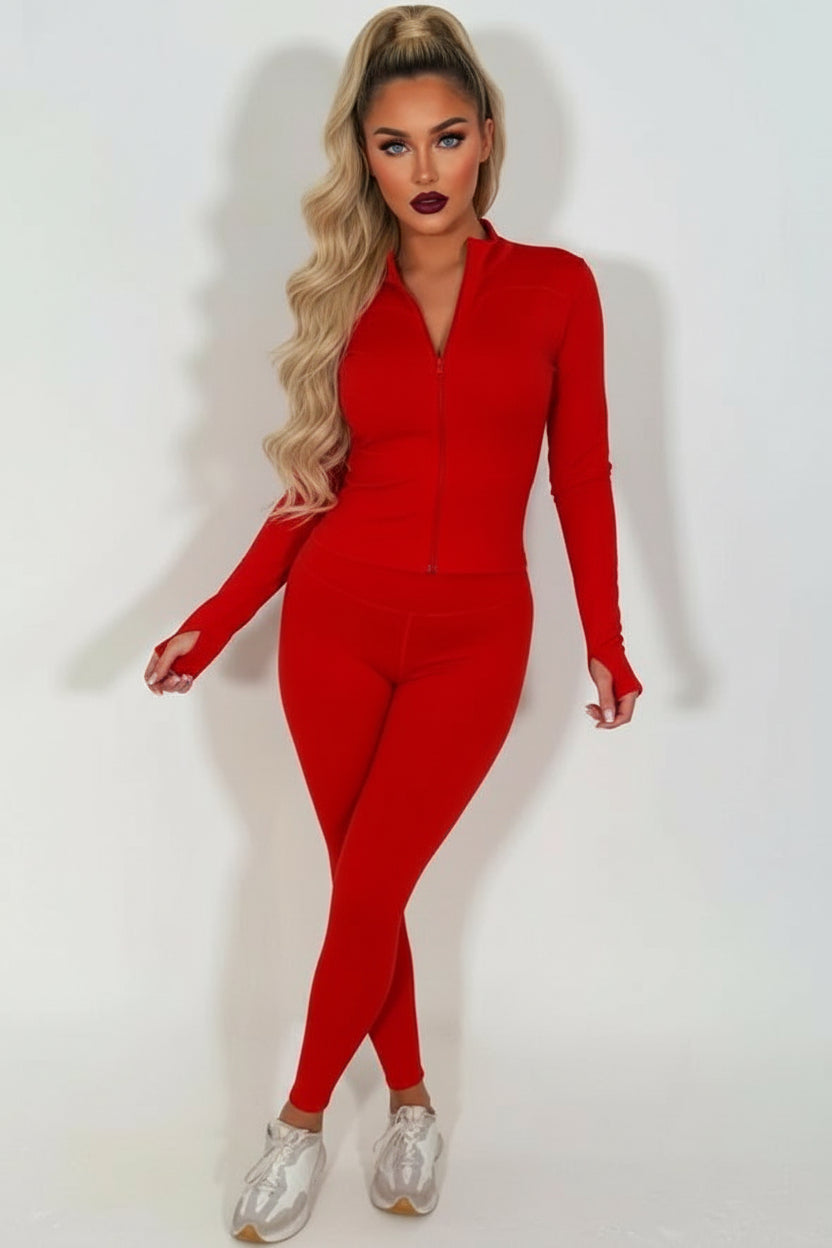 Zip Up Sports Jacket And Seamless Leggings Co Ord Set Red